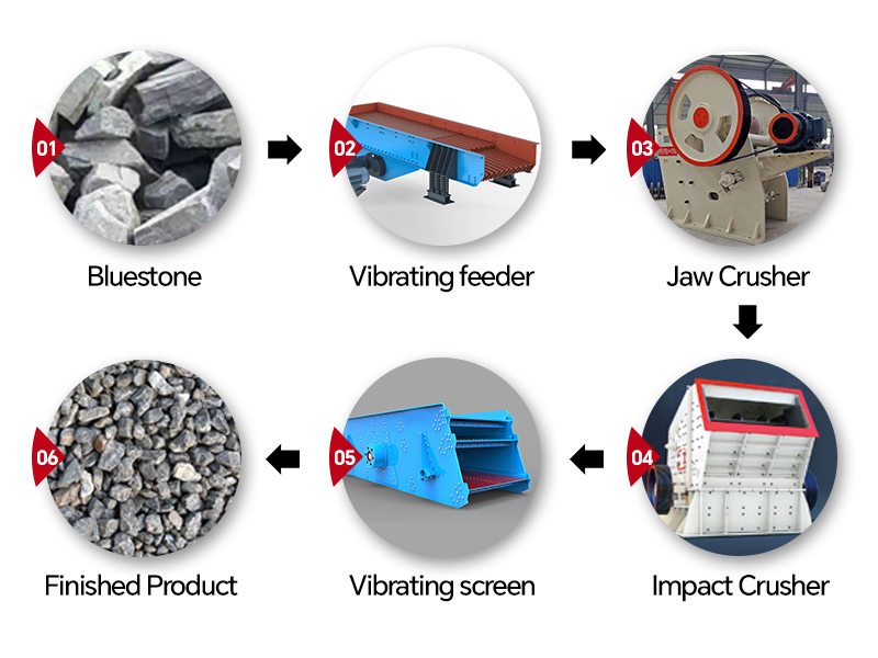 Coarsely crushed bluestone particles from the jaw crusher enter an impact crusher (or hammer crusher) for fine grinding, producing smaller particles.